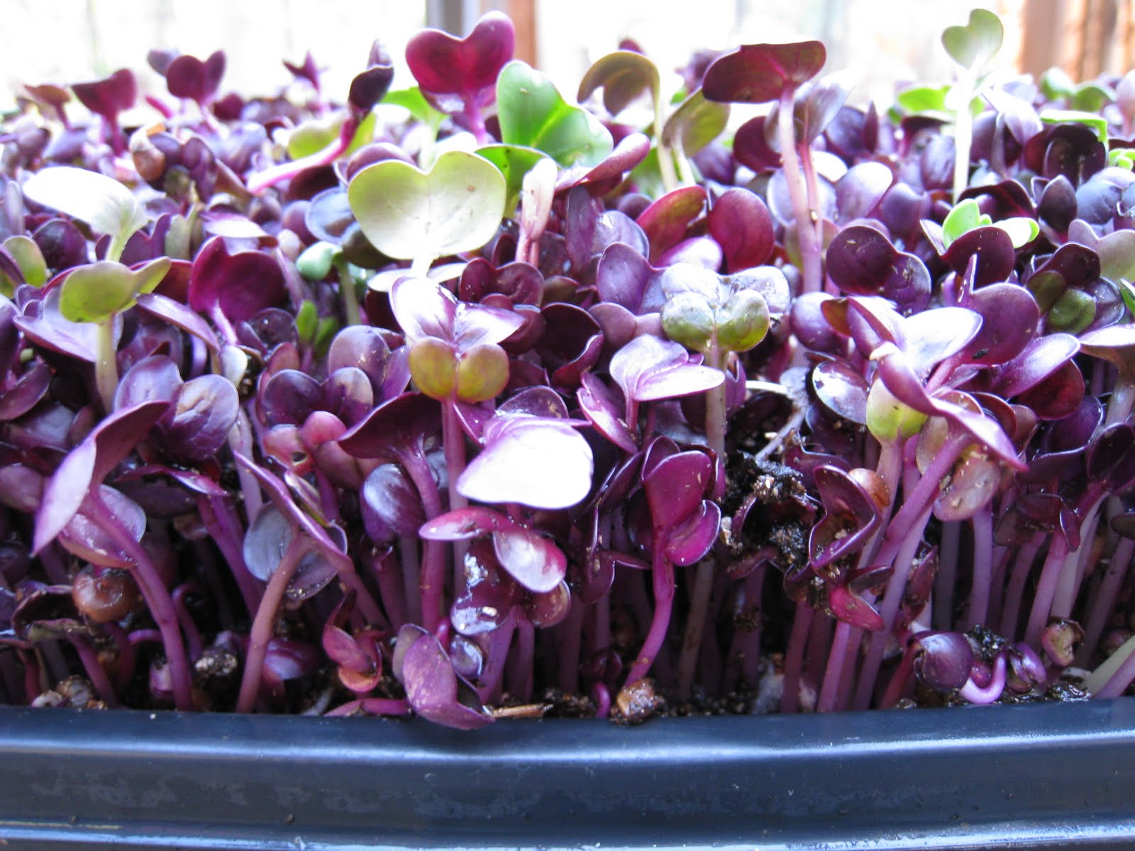 The purple radish shoots growing indoors, in their tray. This photo shows them needing just a few more days to be ready for the mix.